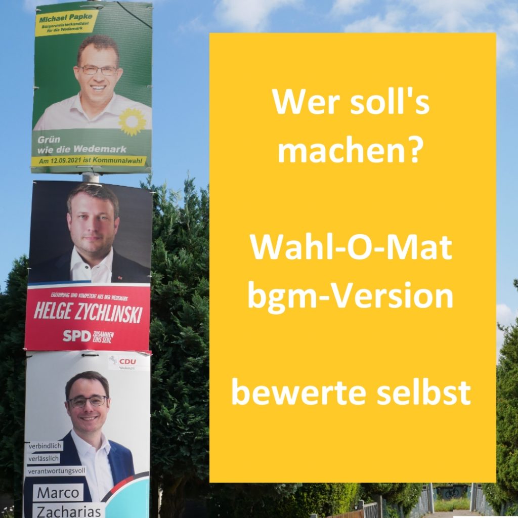 Wir haben in der Wedemark 3 Kandidaten, die sich um das Amt des Bürermeisters bewerben. In der Reihenfolge der Kandidatur sind dies Helge Zychlinski (SPD), Marco Zacharias (CDU) und Michael Papke (Grüne).